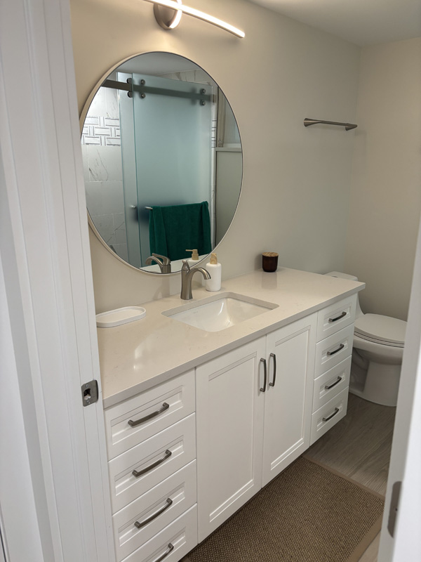 Custom Cambria Mayfair Vanity Top, Backsplash, Window Sill and Shower Curb